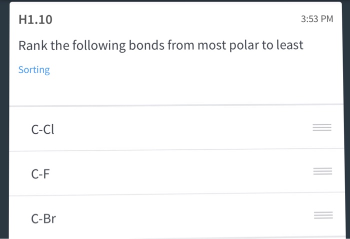Solved Rank The Bonds From Most Polar To Least Polar A Quad Mathrm C Mathrm O Mathrm C Mathrm F Mathrm C Mathrm N B Quad Mathrm C Mathrm Cl Mathrm C Mathrm I Mathrm C Mathrm Br C Quad Mathrm H Mathrm O Mathrm H